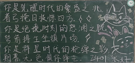 精彩纷呈的板书展现了同学们对传统文化的热爱和尊重,启发同学们对生活、自然和人生哲理的深层思考,展现了学院的活力与魅力,传递了学院的精神风貌,营造了积极向上的校园文化氛围。让我们携手努力,共同为打造更加丰富多彩的校园文化贡献力量!